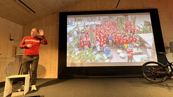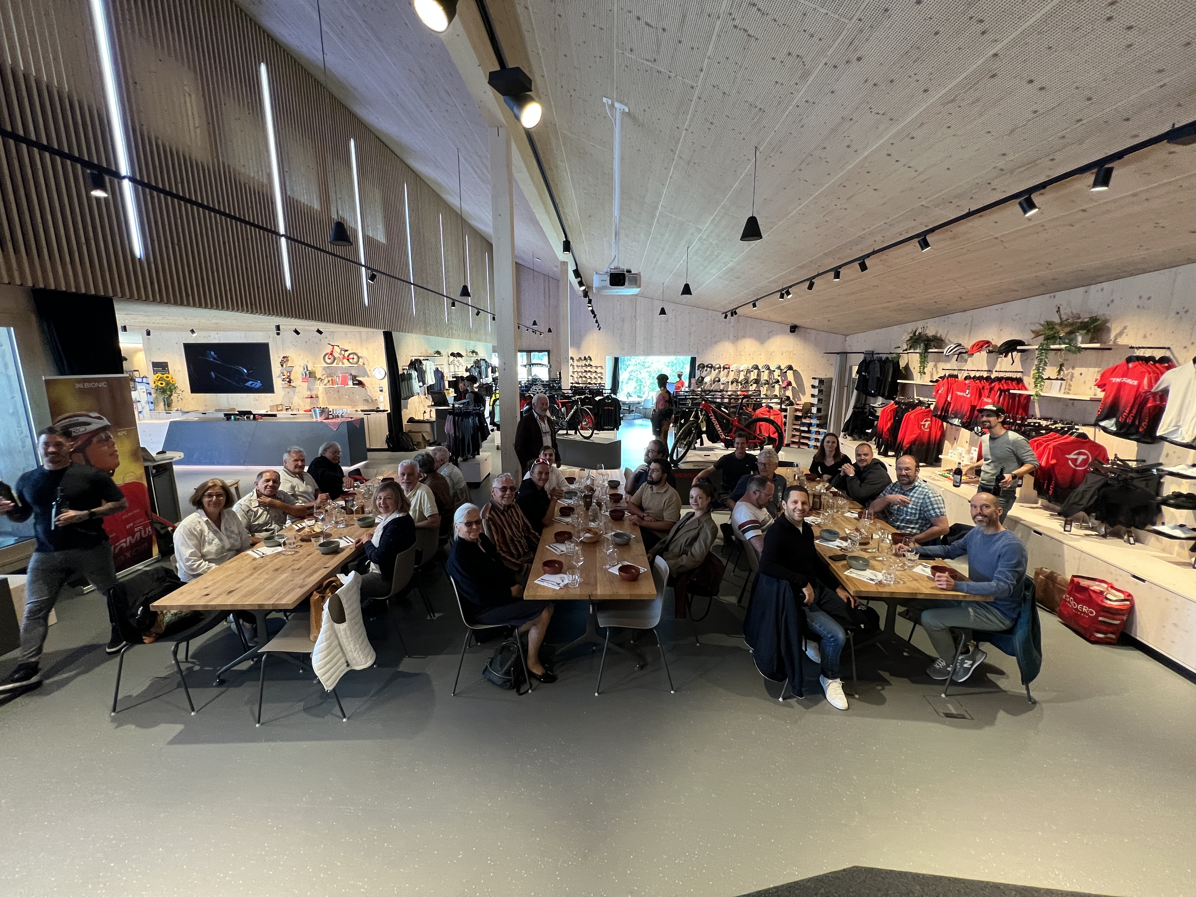 Après le repas, Thomas Binggeli nous donne une conférence sur son parcours et sur ce lieu, fruit de sa passion. Destiné à reprendre la ferme familiale, il choisit finalement de vivre de sa passion pour le vélo en ouvrant un atelier d’entretien de cycles à l’âge de 17 ans. Quelques années plus tard, il fonde la marque Thömus et crée ses premiers vélos avec des partenaires. En 2009, il pousse encore plus loin sa créativité en développant le premier Stromer, avec l’objectif de rendre le vélo électrique à la fois beau et performant, ce qu’il concrétise avec le Stromer V1.