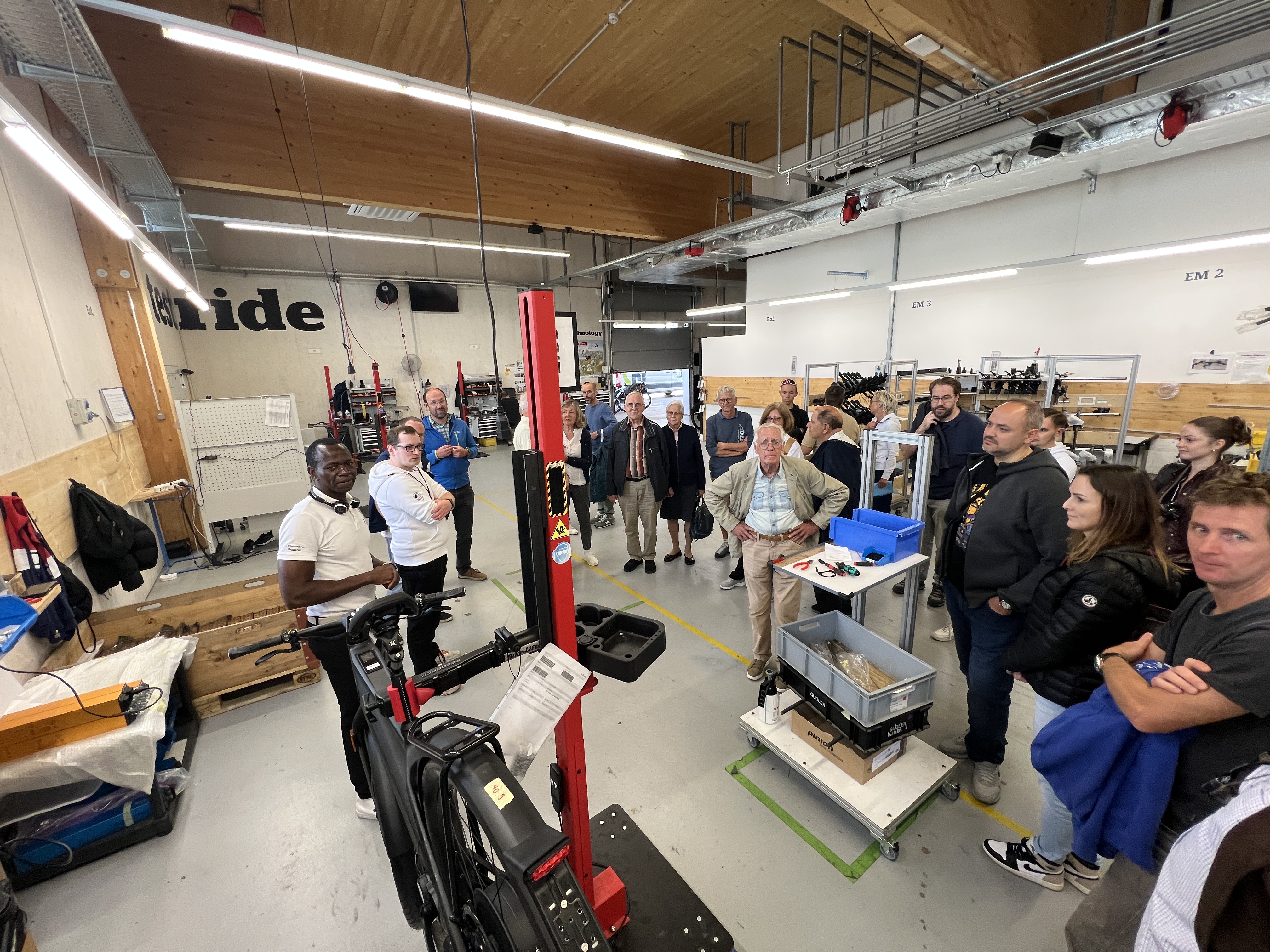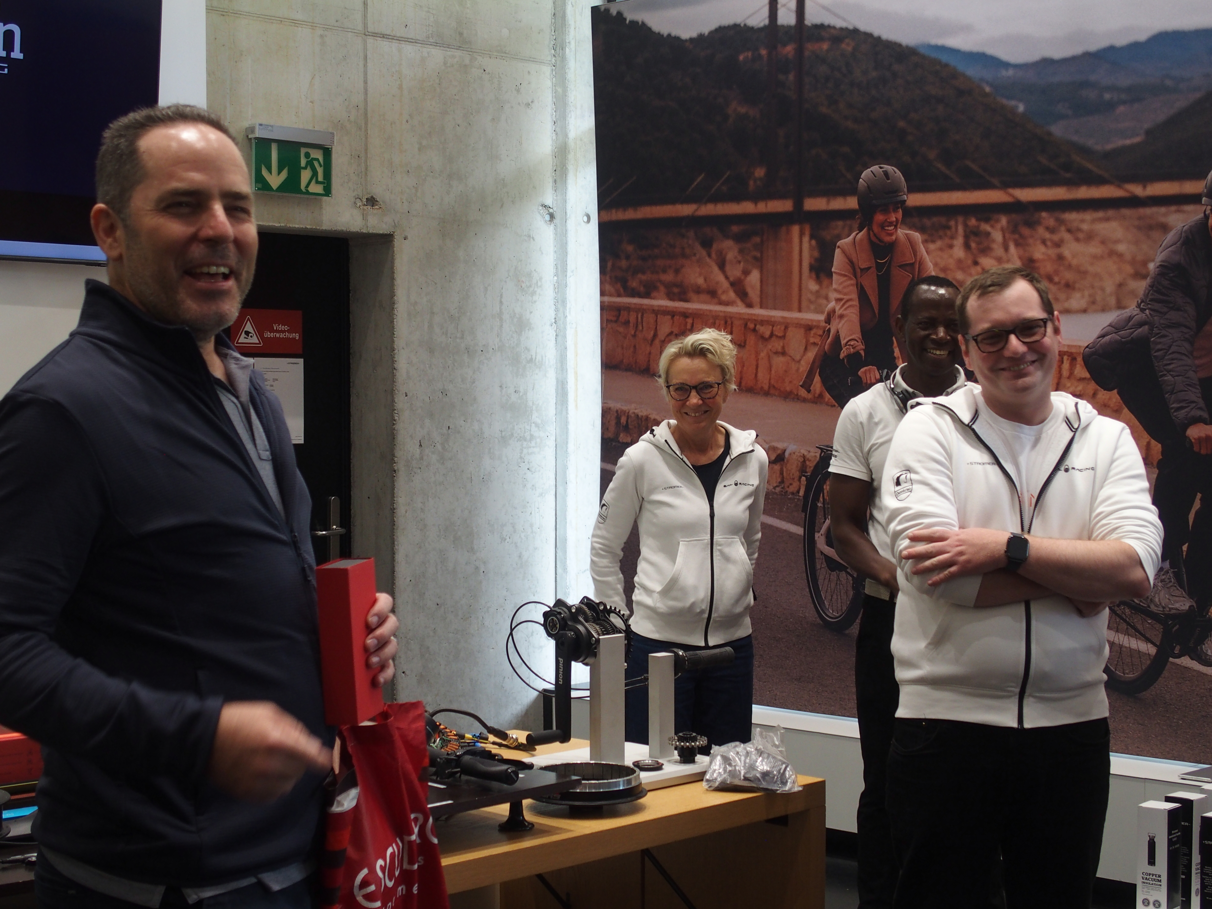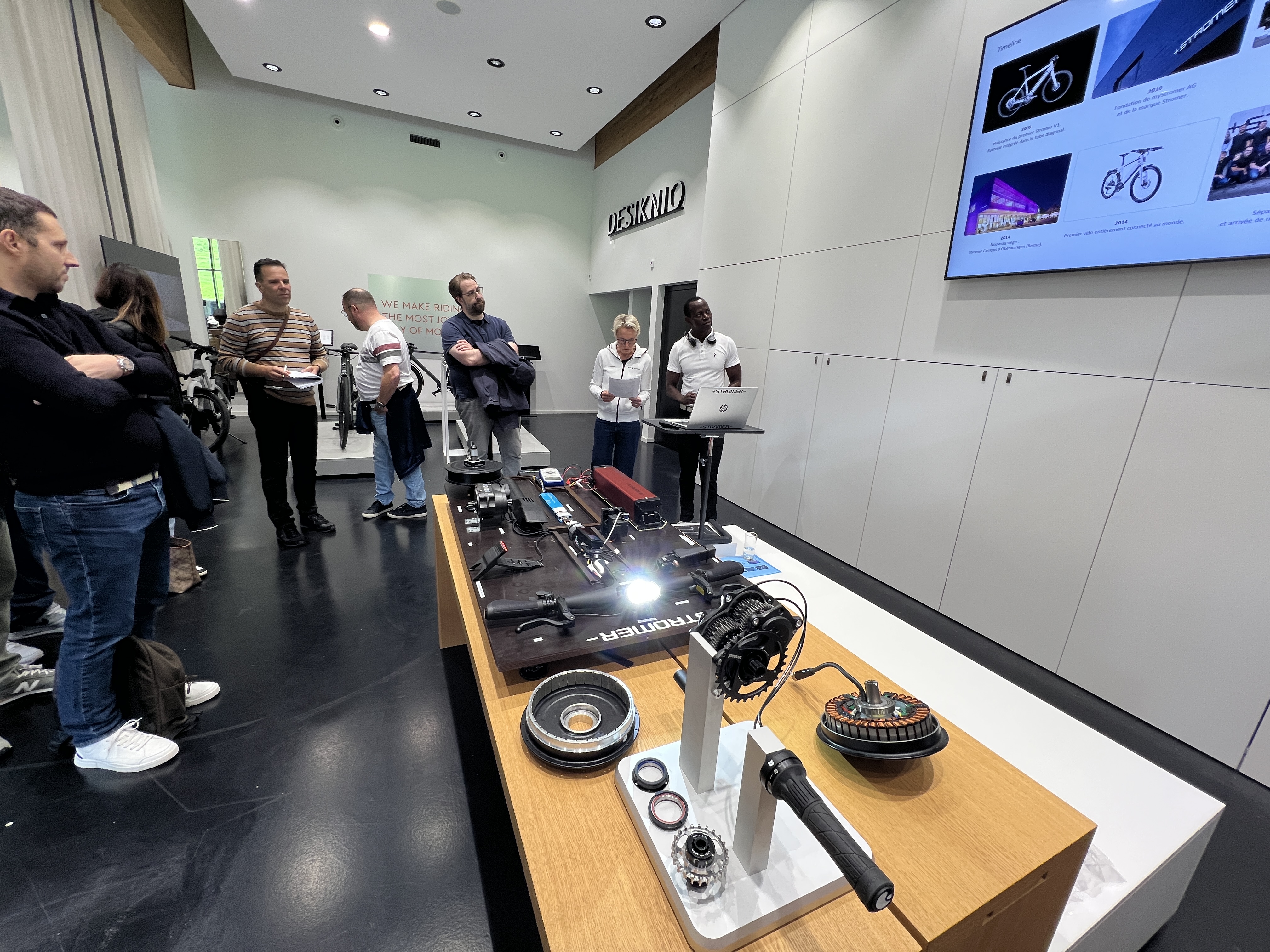 Lors de la visite de l’usine, nos hôtes nous guident dans les spacieux locaux en évitant soigneusement les bureaux de recherche et développement. Nous traversons un entrepôt rempli de vélos prêts à être livrés, avant d’assister aux explications techniques sur la ligne d’assemblage. Jusqu’à 35 vélos par jour peuvent être assemblés en passant successivement par sept postes de travail. En moyenne, 80 minutes sont nécessaires pour assembler un vélo. Nous poursuivons ensuite dans le showroom, où une vidéo présente en détail la marque et ses innovations. Une maquette très instructive permet de découvrir l’ensemble des composants du vélo. Tous les éléments fonctionnels — capteurs, moteur, freins, éclairage et électronique — sont fixés sur un présentoir et reliés par des torches électriques, illustrant concrètement leur fonctionnement. Le moteur sans balais, présenté en coupe, permet d’admirer le soin apporté à sa conception et à sa fabrication. Il est intégré avec ingéniosité dans le moyeu de la roue arrière, soulageant ainsi la courroie de transmission, qui ne transmet que l’énergie fournie par le pilote.