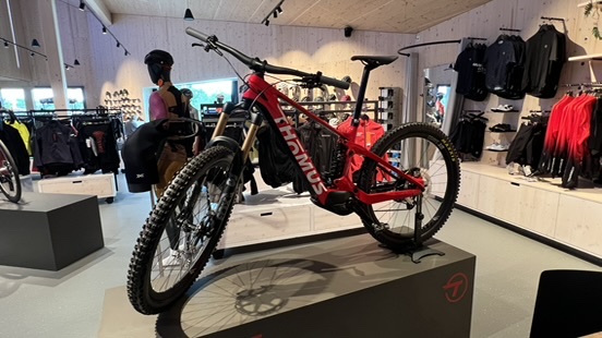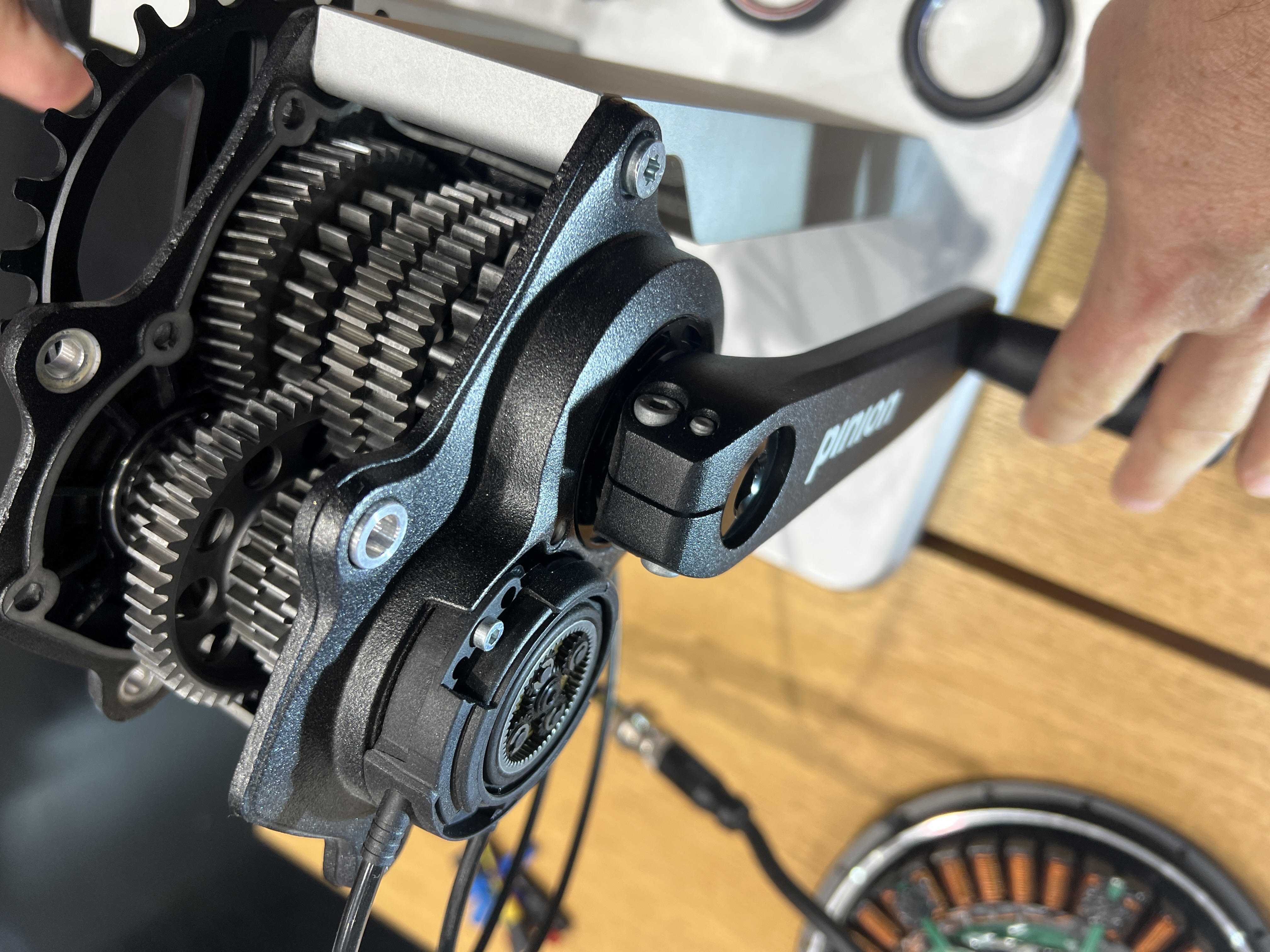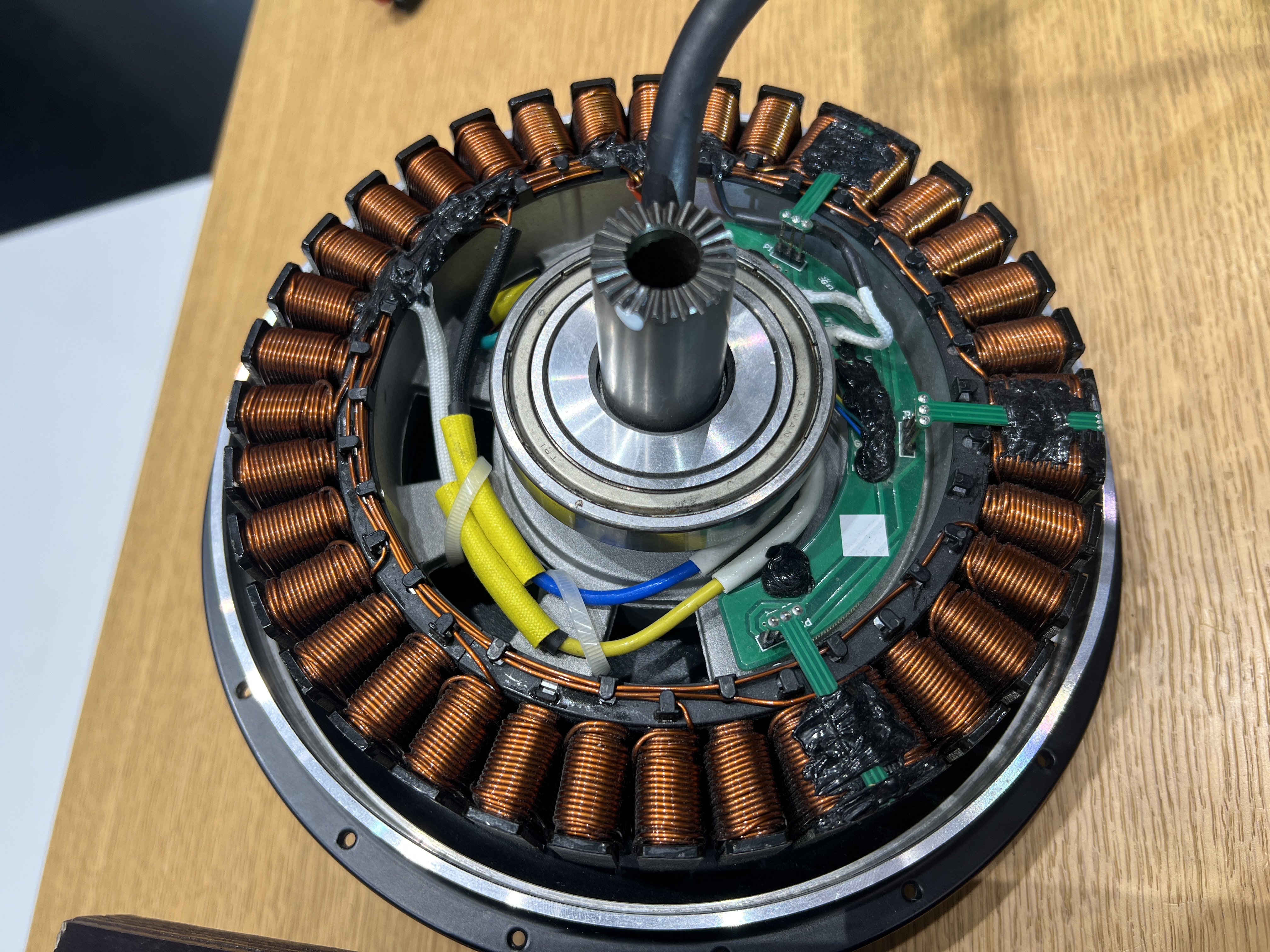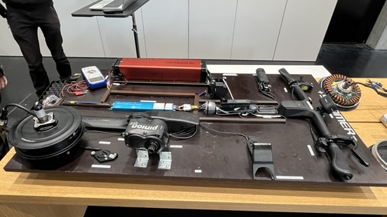 Lors de la visite de l’usine, nos hôtes nous guident dans les spacieux locaux en évitant soigneusement les bureaux de recherche et développement. Nous traversons un entrepôt rempli de vélos prêts à être livrés, avant d’assister aux explications techniques sur la ligne d’assemblage. Jusqu’à 35 vélos par jour peuvent être assemblés en passant successivement par sept postes de travail. En moyenne, 80 minutes sont nécessaires pour assembler un vélo. Nous poursuivons ensuite dans le showroom, où une vidéo présente en détail la marque et ses innovations. Une maquette très instructive permet de découvrir l’ensemble des composants du vélo. Tous les éléments fonctionnels — capteurs, moteur, freins, éclairage et électronique — sont fixés sur un présentoir et reliés par des torches électriques, illustrant concrètement leur fonctionnement. Le moteur sans balais, présenté en coupe, permet d’admirer le soin apporté à sa conception et à sa fabrication. Il est intégré avec ingéniosité dans le moyeu de la roue arrière, soulageant ainsi la courroie de transmission, qui ne transmet que l’énergie fournie par le pilote.